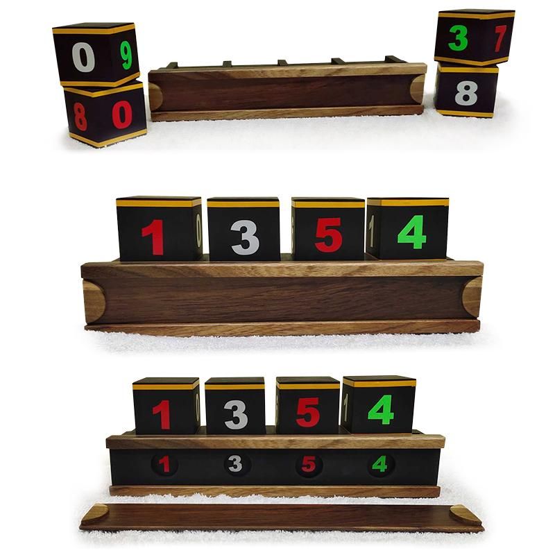 A display stand with four cubes displayed. Each cube has a variety of numbers and colours on each of four sides. Spectators freely choose how the cubes are arranged on the stand. In spite of the thousands of combinations, when the prediction is revealed, it's seen to match perfectly.