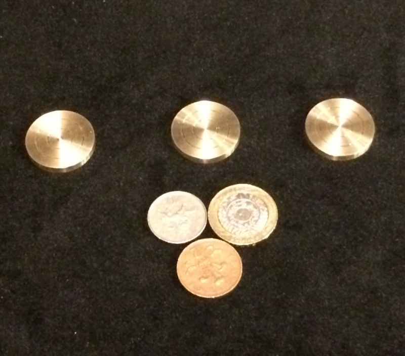 Three brass caps and three different coins are given for thorough examination. The Magician places a small wallet containing both an instruction and prediction onto the table. Turning away, the magician instructs the spectator to cover all three coins, with all three caps, in any order. The spectator now mixes the caps around so no one knows the order of the coins beneath. This done, the Magician turns to face the audience, removes the instruction card from the wallet and them magician or spectator read it aloud. It instructs the spectator to change the places of certain caps, without lifting them. The magician then removes the prediction card from the wallet, the spectator lifts the caps, the prediction matches the order of the coins exactly.