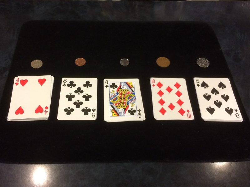 This is a great self working magic trick. When you receive the trick, simply follow the instructions and the tricks works itself on you. This trick was a complete sell out when first shown at the Blackpool Magic Convention, in stock now and ready for orders. A mentalist's dream, a self working card/coin trick that has a huge impact, selling on sight when demonstrated.Five different coins are handed to a spectator along with a pack of cards. The magician places a prediction face down and requests that the spectator places the coins in a random order on the table. This done, the magician now deals a pile of cards in front of each coin according to its value (a 10p coin has 10 cards, 5p coin 5 cards etc). The top card of each pile is turned up and the prediction is revealed. The five face cards match perfectly with the prediction.We now offer a variety of versions of this great effect. The standard version is the prediction version as described above using regular coins and a prediction, The Royal Flush version, uses regular coins and simply reveals the five cards as a 'Royal Flush'. Both of these versions are now available with numbered Poker Chips instead of using coins.All versions work great, the more popular being the standard one using regular coins.Very easy to perform, you'll work this right away.