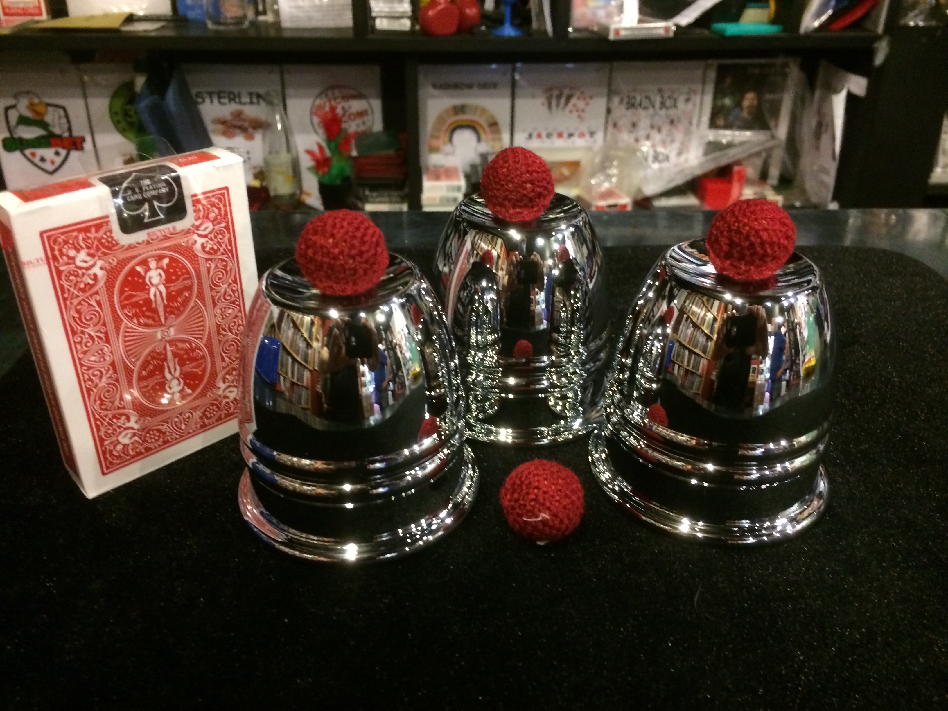 The cups are in a variety of sizes and metals, you should choose what you would find most suitable to your performance style. ;Obviously, the Aluminium Cups are going to be much lighter than the Steel or Brass ones. Video shows the Giant Cups & Balls (4"x3.75") in a short performance. The approximate size of the cups is shown in inches (height first, diameter second) The Cups & Balls are a classic magician's prop, capable of a huge variation of routines and sets are made from a variety of materials.We always have a large variety of sets in stock in our London shop, or you can choose from our more popular sets in the drop down menu.