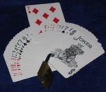 Ideal to give a story about Harry Houdini escaping from a padlock. The chosen card vanishes effortlessly in this effective trick, without any sleight of hand. A very unusual card trick. A pack of cards has a hole drilled through one corner, it is riffled through to have a card stopped at. The entire deck is now padlocked through the hole and the chosen card named. Amazingly, when the spectator check through the pack, the card they have just seen is now vanished, the magician opens the card box to reveal the card now returned to the box.
