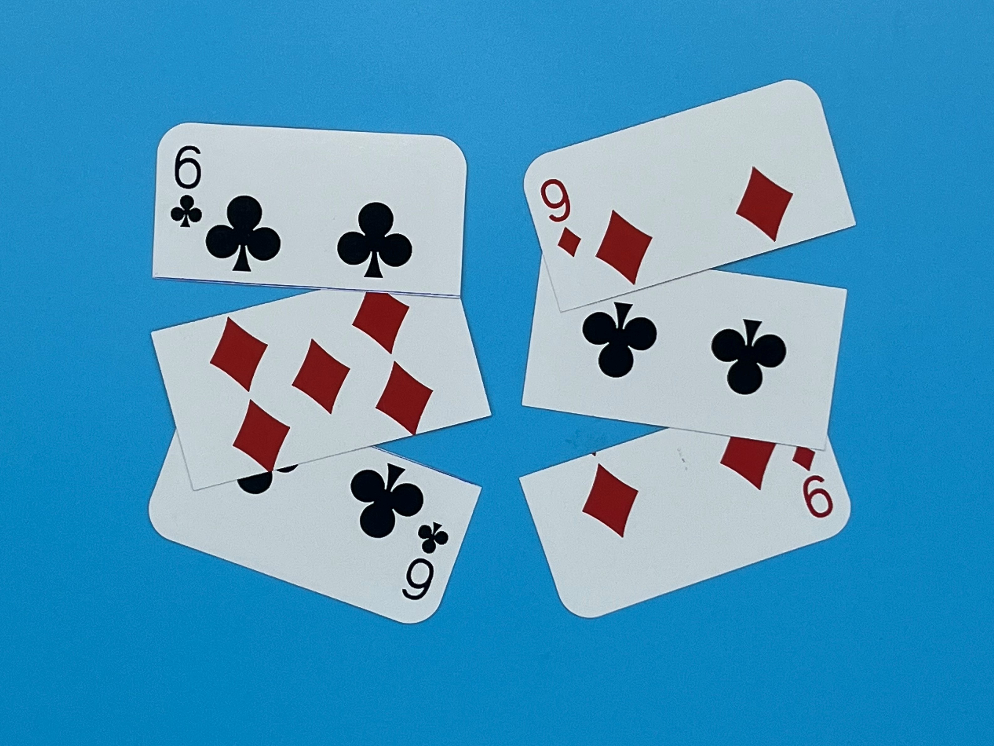 - Pieces of two cut up jumbo cards are mixed together