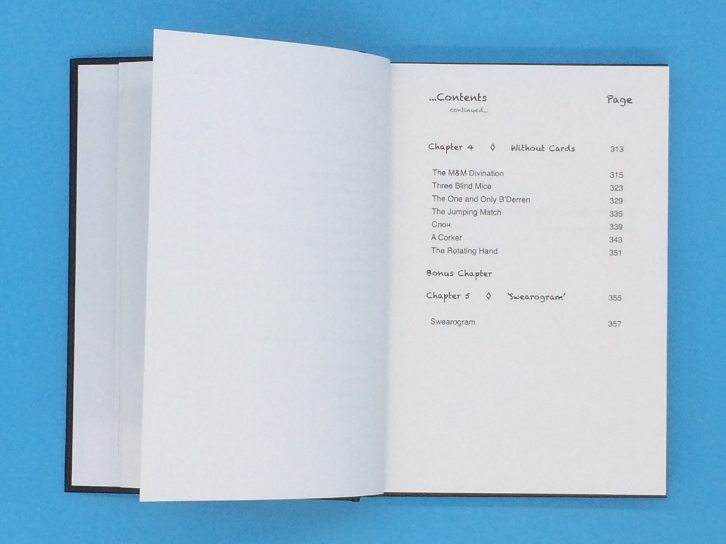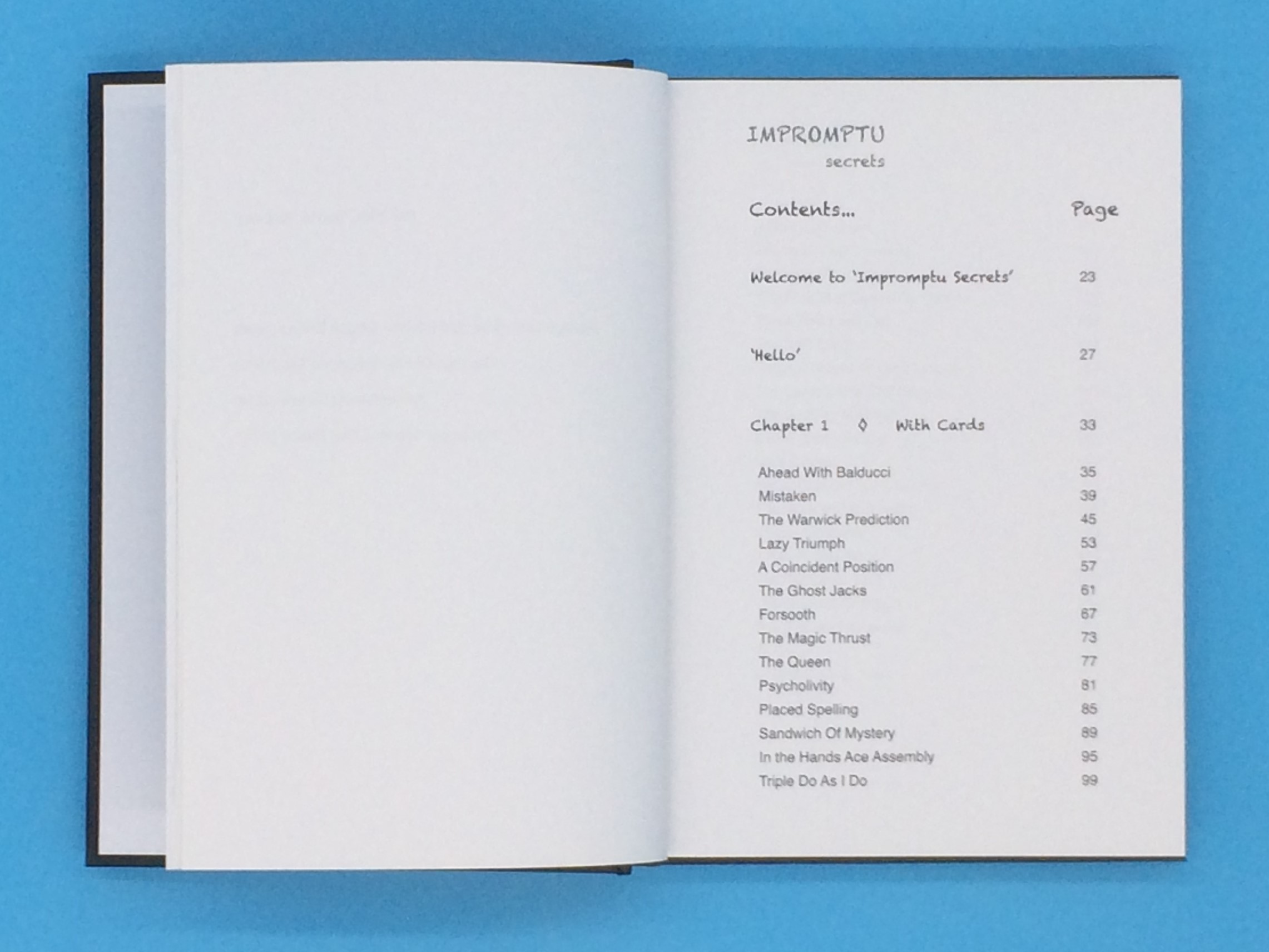 Contents:This book was released in February 2018, it quickly received recommendation and accolade from known card magicians resulting in the first print being sold out within months.Chapter 1 - With CardsAhead With BalducciMistakenThe Warwick PredictionLazy TriumphA Coincident PositionThe Ghost JacksForsoothThe Magic ThrustThe QueenPsycholivityPlaced SpellingSandwich Of MysteryIn The Hands Ace AssemblyTriple Do As I DoA Borrowed MatchSpectator Cuts The AcesFadeaway PredictionThe Trick That Cannot Be NamedThree Times and OutThe DAB CardsTOCA (Thought Of Cards Across)The Cards Under The BumsThe Drunken MagicianA New Trick For LucyMental PilesHenry Christ's Four Ace TrickThe Mexican MindreaderBicycle BagatelleA Pain In The NeckThe Cambodia TrickThe Emperor Of NosesThe Sichuan RevelationAll BacksA Night On The TownChapter 2 - Some MovesBlow PassOne Card Dribble PassVernon - Le Paul Second DealAny Colour You LikeA Card VanishOut, In and Off: An Overhand Shuffle TechniqueThe P.O.P. Bottom DealInterlock ChangeDiminishing Lift SequenceThe Noah CountThe 'Malini' Colour ChangeChapter 3 - From VernonThe Message CardFour Card Pick UpFour DeucesNumber NineChapter 4 - Without CardsThe M&M DivinationThree Blind MiceThe One and Only B'DerrenThe Jumping MatchCnohA CorkerThe Rotating HandChapter 5 - Bonus ChapterSwearogram368 pages - hardbackDue to its success, a second print was completed in December 2018, this also sold out and again the book was unavailable.We're proud to announce that a third print was completed in November 2021 and this excellent book is again available from stock.This is what others have to say about 'Impromptu Secrets'...Peter Duffie...'If I were told about a new book featuring over 30 card effects, 11 moves, 8 non ;card items and 4 previously unpublished Dai Vernon items, I would be interested.However, when the author of the book is a former pupil of the late and great Fred Robinson, I would be more than merely curious; I would need to have it. And, I am glad that I do have it, because this is a book crammed with lovely ideas and wonderful thinking.I highly recommend this book.'Jerry Sadowitz...'This book is not so much a breath of fresh air but a blast of nitrous oxide! There are some real gems of magic in here...strong and clear in effect, concise and subtle in ;method. This is magic that greatly satisfies magicians without ever sacrificing entertainment value for laymen. There is absolutely no "filler" material here and as you will discover, many of the tricks in these pages are individually worth the price of the entire book.There is also a short article about the Malini colour ;change which is the most riveting thing I have read in years, containing food for thought of which the magic community is normally starved. I hope he writes more like this in the future.As if that wasn't enough, there is a chapter of previously unpublished Dai Vernon material!Dominic Twose was a student and confidante of Fred Robinson and other underground ;legends such as Eric Mason and Gordon Bruce. Like all the best magicians I know, Dominic is also a Vernon disciple and a Roy Walton fan and it shows in this, his first major work. You'll love this book.'Stephen Minch...If the newest flashy gimcrack to impress your video camera is what you want, ignore Impromptu Secrets. All you'll get here is strong, performance-tested magic for live audiences, featuring some very smart ideas and solid thinking from Dominic Twose. Dominic's may not me a household name in your neighborhood, but he's a magician who's been around the block a few times with the best of them.Gordon Bruce...I have known Dominic for more years than I care to remember and spent many pleasant hours with him in the Marlborough Arms near the Magic Circle usually in the company of Fred Robinson and Eric Mason; also Bob Read and occasionally Alex Elmsley. Like myself Dominic tends to specialise in cards, and many times I have seen him entertain layman impromptu with great results.Undoubtedly you will find much of value in this his latest book.