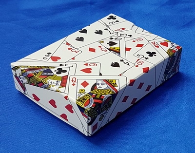 A most unusual card trick - where the case is covered with images of playing cards. A pack of cards is inside the case and it's all simply handed to a spectator to choose any card from the outside of the case. It's then handed to another spectator, who also chooses a card. The magician then proceeds to reveal both cards, in two uniquely different ways.